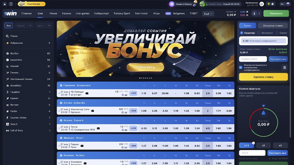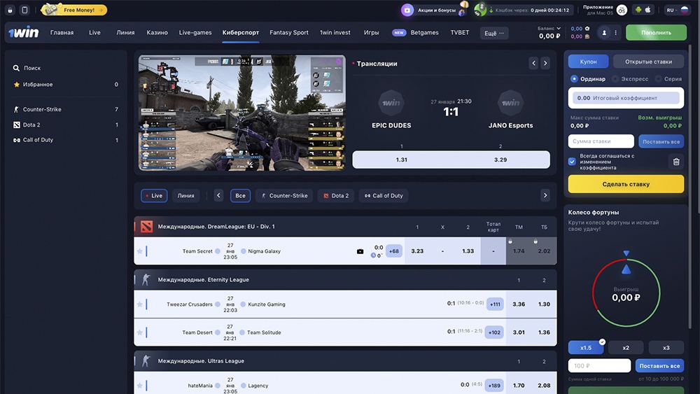 - На официально сайте 1Win есть ставки на спорт и киберспорт;